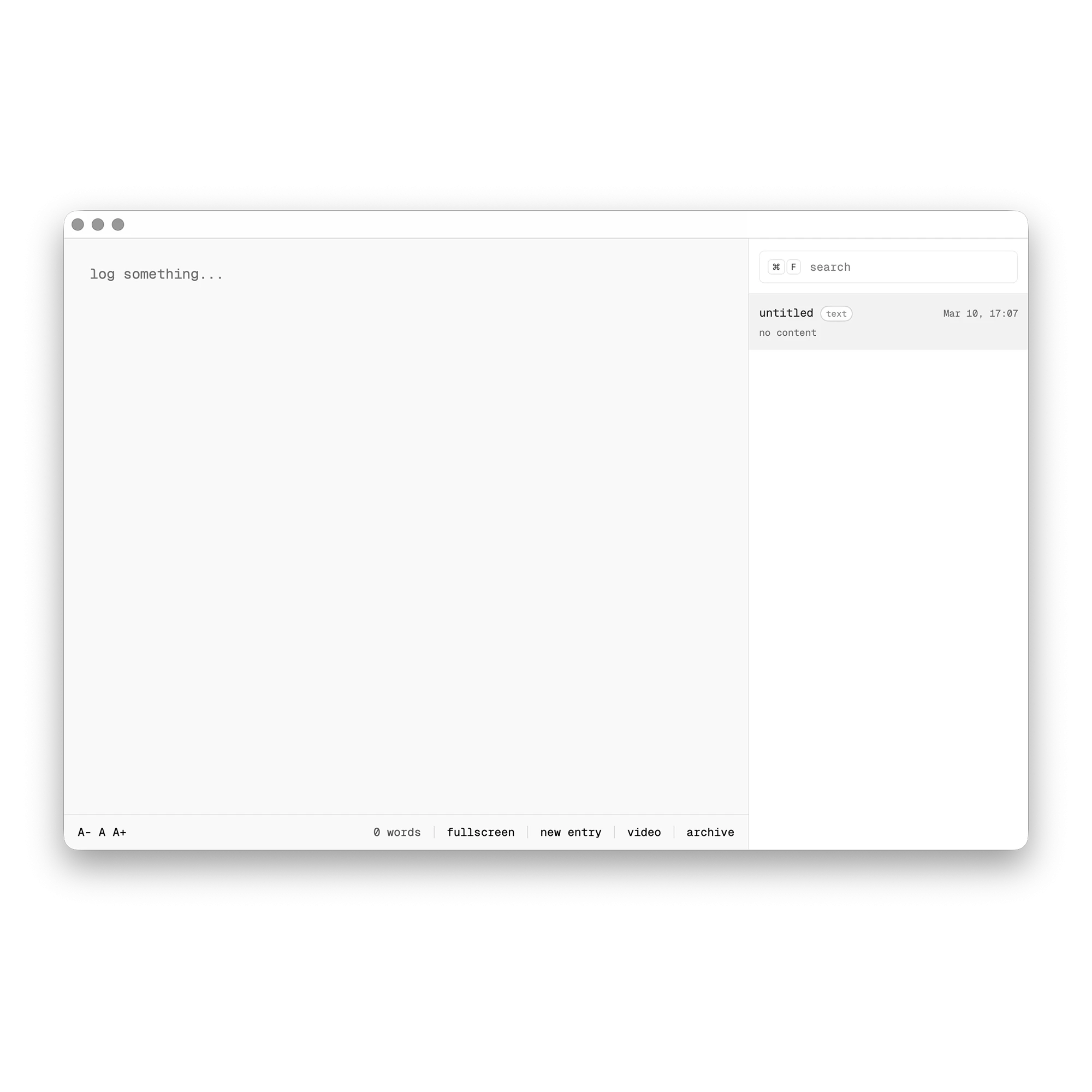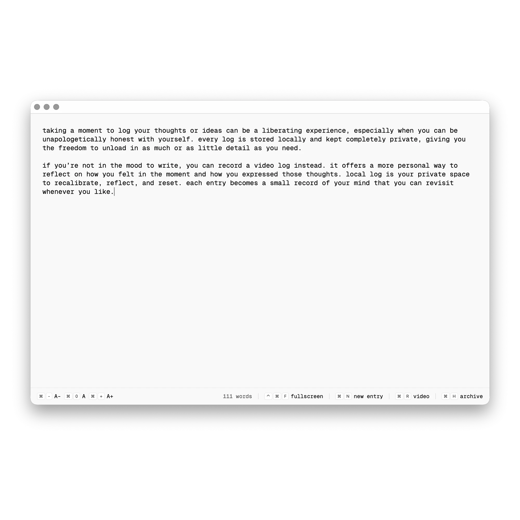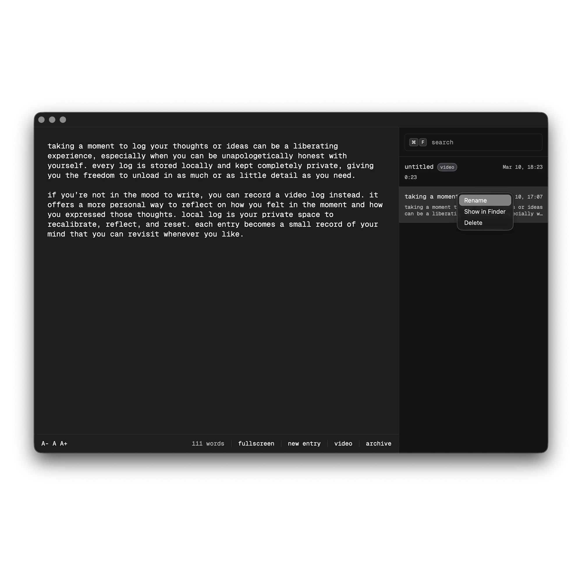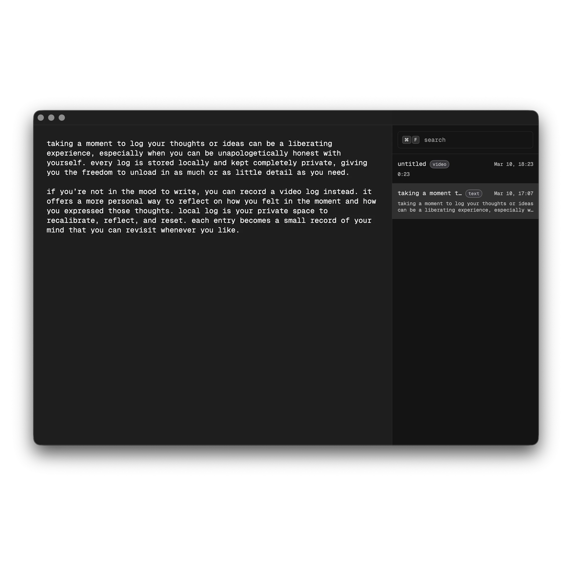 Local Log is a minimal and open-source macOS journaling app built for fast, frictionless capture. It lets you record both text and video entries in one quiet, focused space, with everything stored locally on your Mac for privacy and simplicity. No accounts, no cloud dependency, no clutter—just a clean archive of your thoughts, searchable and always yours. With autosave, editable entry titles, keyboard shortcuts, and light and dark mode support, Local Log is designed to stay out of the way so you can get straight to logging.